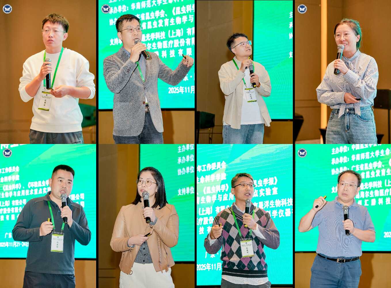 中国科学院动物研究所白明研究员以“生物多样性暗物质的挖掘评估和监测应用”为题,介绍了团队在昆虫标本采集与高质量监测、表型数据提取与表征、地理大数据处理等方面开发的一系列高效工具和方法;中国科学院动物研究所郭晓娇副研究员作了题为“蝗虫群聚信息素的生物合成与人工操控”的报告,解析了飞蝗聚集信息素4VA的生物合成途径,并介绍了基于关键合成酶结构开发小分子抑制剂用于蝗虫防控的实践;广东省农科院植保所张松斗副研究员以“果树木虱类害虫适宜温度及传播植物病原细菌的分子奥秘”为题,全面介绍了其团队近年来在木虱害虫夏冬转换和传病机制方面的最新进展;首都师范大学杨美玲教授作了“m⁶A修饰驱动相分离发生调控飞蝗蜕皮”的报告;西南大学董照明副研究员作了题为“高性能昆虫丝的研究与应用”的报告;广东省农业科学院植物保护研究所陈洁研究员作了“rRNA稀有甲基化修饰蛋白的功能研究”的报告;安徽师范大学靳鹏宇教授作了题为“蜘蛛捕猎行为演化的神经和遗传基础”的报告;南开大学叶瑱研究员作了“半水生蝽类昆虫的多样性格局和演化”的报告;浙江农林大学叶昕海教授介绍了寄生蜂比较基因组研究进展;中国农业大学段元格副教授作了“昆虫A-to-I RNA编辑的适应性演化”的报告。