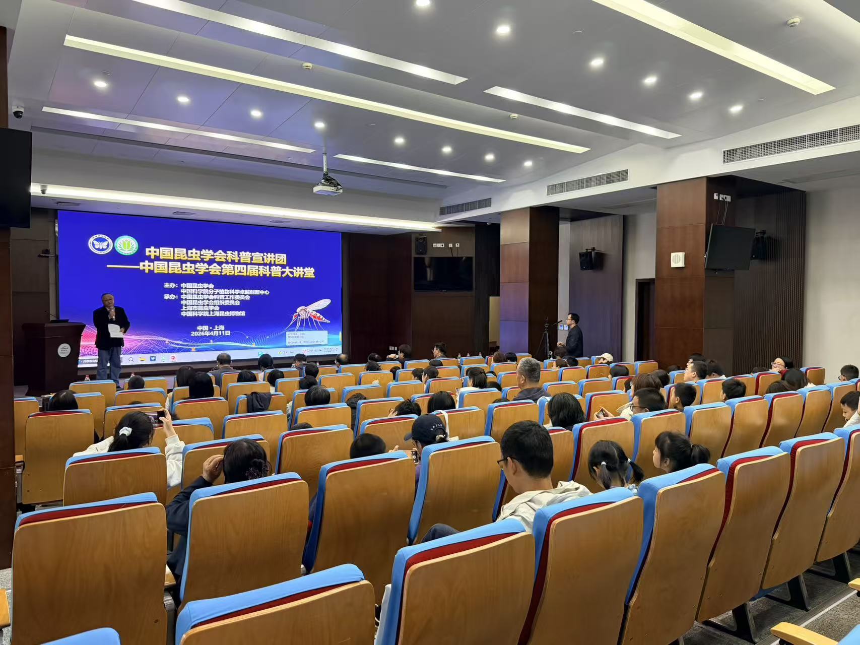 为全面落实《中国科协关于新时代加强学会科普工作的意见》精神,进一步打造中国昆虫学会科普品牌,传播科学思想、倡导科学方法,2026 年 4 月 11 日下午,中国昆虫学会第四届科普大讲堂在上海昆虫馆成功举办。本次大讲堂以 “科技与未来 —— 昆虫与人类健康” 为主题,特邀中国昆虫学会第八、第九届副理事长、上海交通大学黄勇平教授,中国昆虫学会副理事长、中国科学院分子植物科学卓越创新中心王四宝研究员担任主讲嘉宾。中国昆虫学会理事长戈峰研究员、中国科学院动物研究所所长乔格侠研究员、中国科学院分子植物科学卓越创新中心党委副书记张余研究员、中国昆虫学会常务副秘书长孟晓星、中国昆虫学会科普工作委员会主任魏永平等出席活动,中国昆虫学会副主任委员、上海昆虫博物馆馆长殷海生主持。来自上海市的 150 名中小学生及家长现场参与。活动图片直播浏览量达到4.6万。